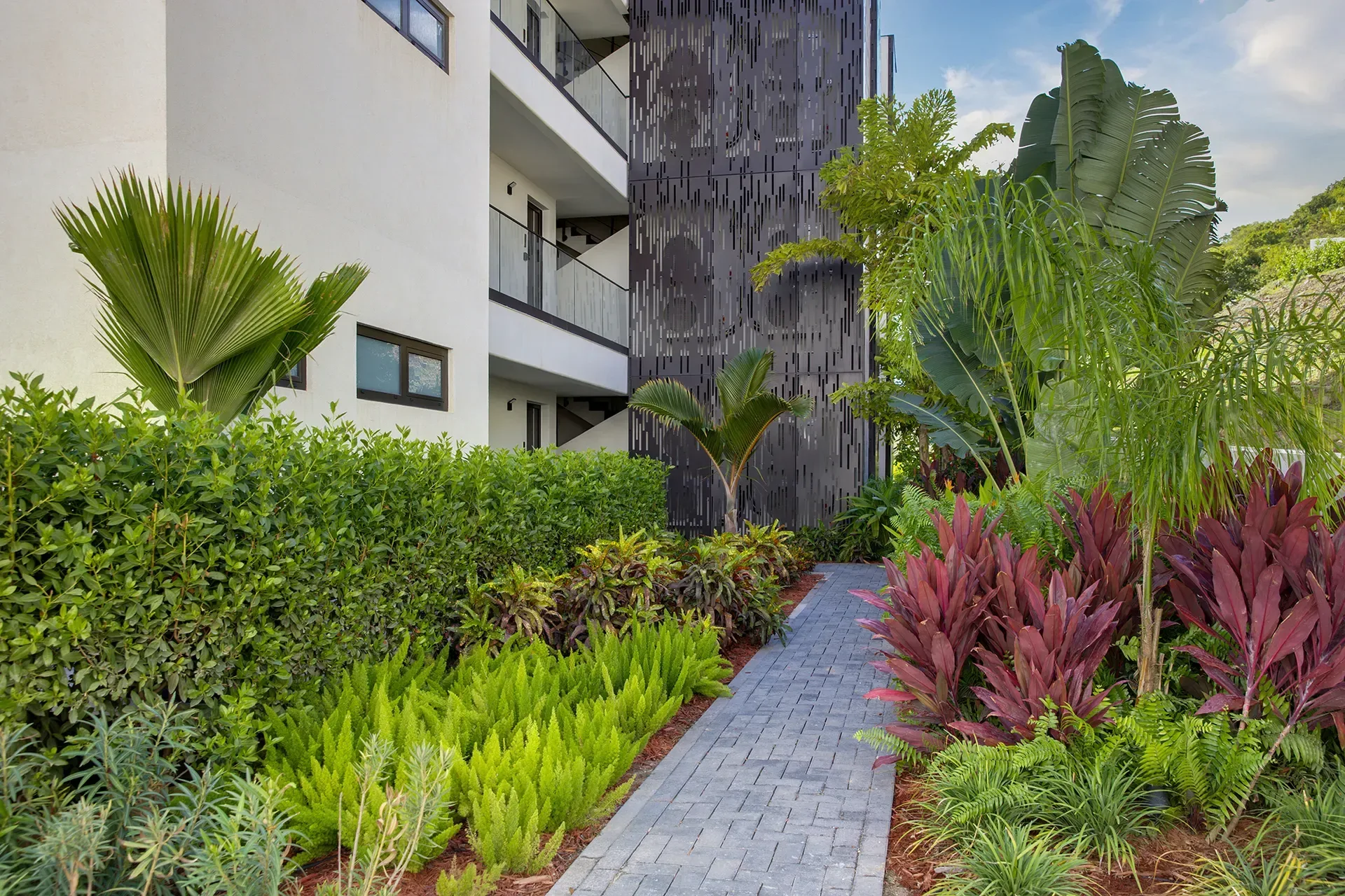 Jardin d’angle privé avec vue sur le lagon, parfait pour profiter du climat tropical et de moments de détente.