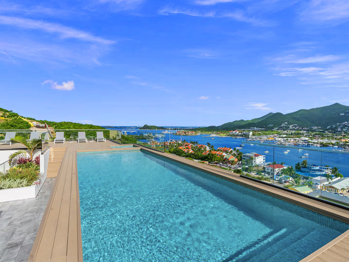 Accès au toit avec une piscine commune et un Jacuzzi luxueux, parfaits pour se détendre.