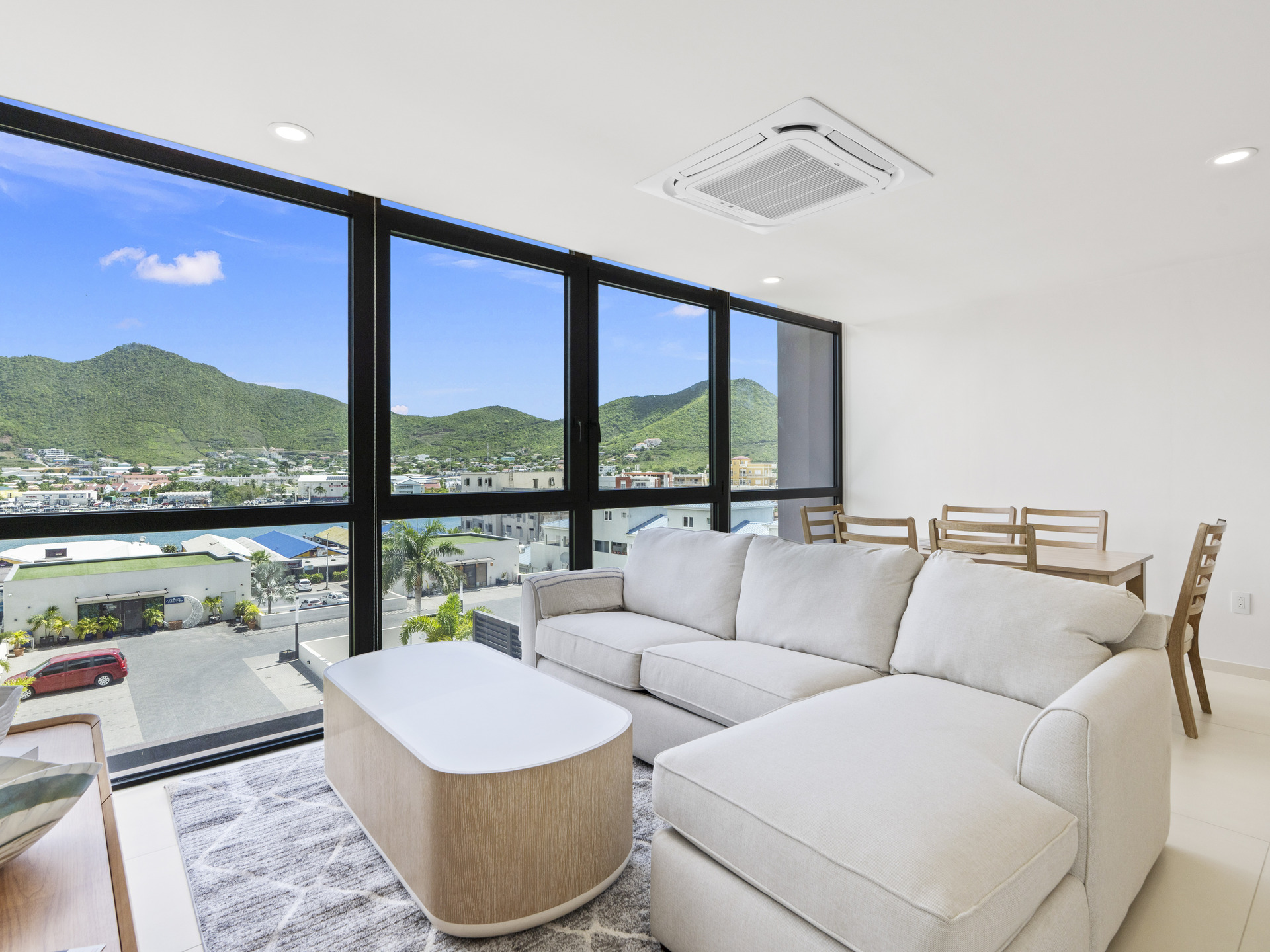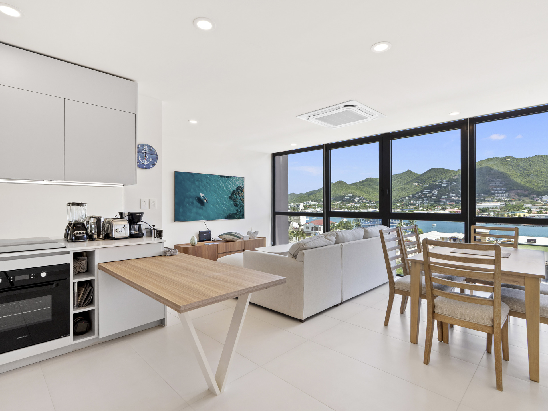 Le salon est spacieux et idéal pour se détendre ou passer du temps avec ses proches. La grande baie vitrée laisse entrer la lumière naturelle et offre une vue magnifique sur le lagon de Simpson Bay. C’est l’endroit idéal pour savourer votre café du matin ou vous détendre après une journée de visites.