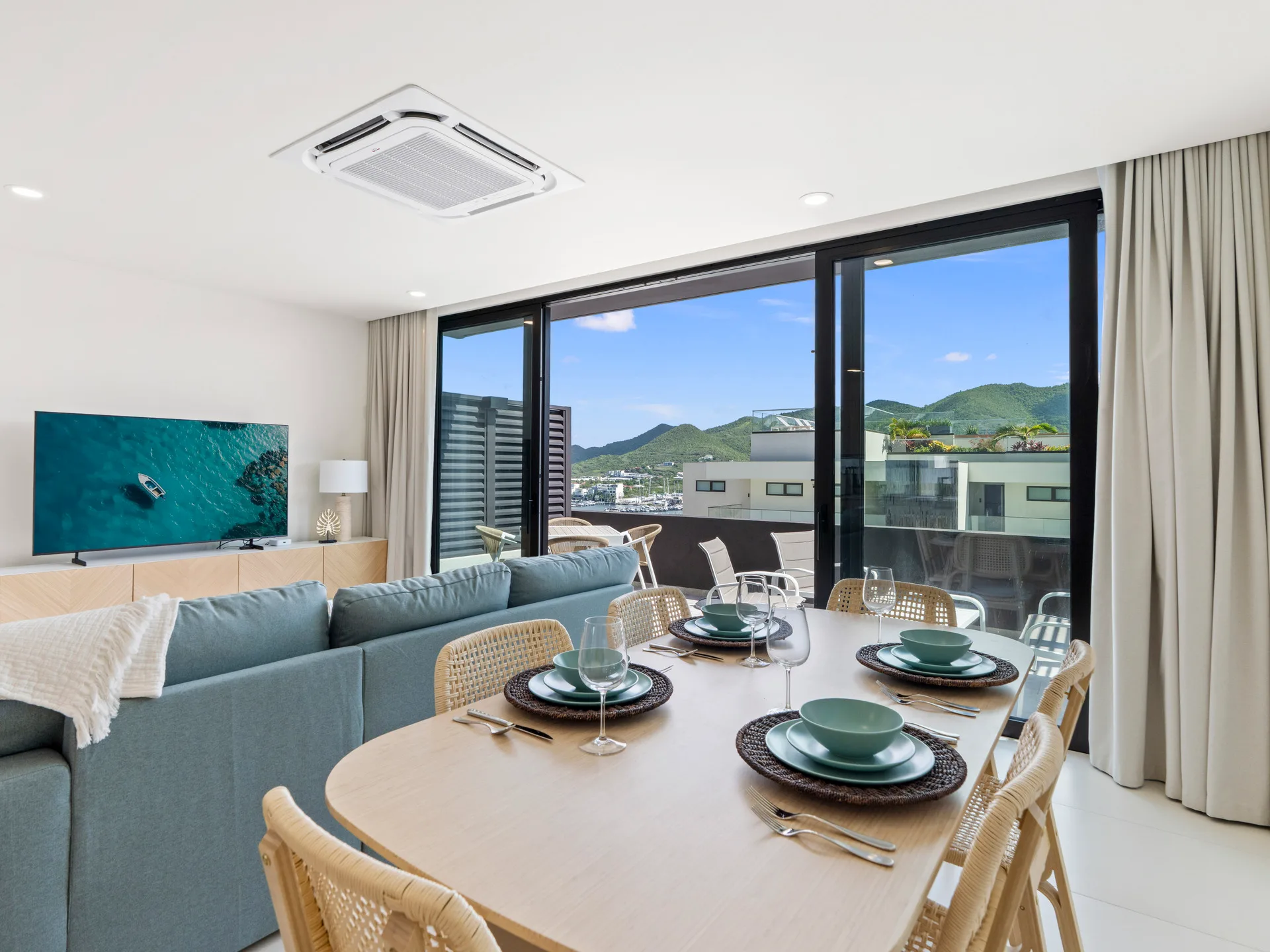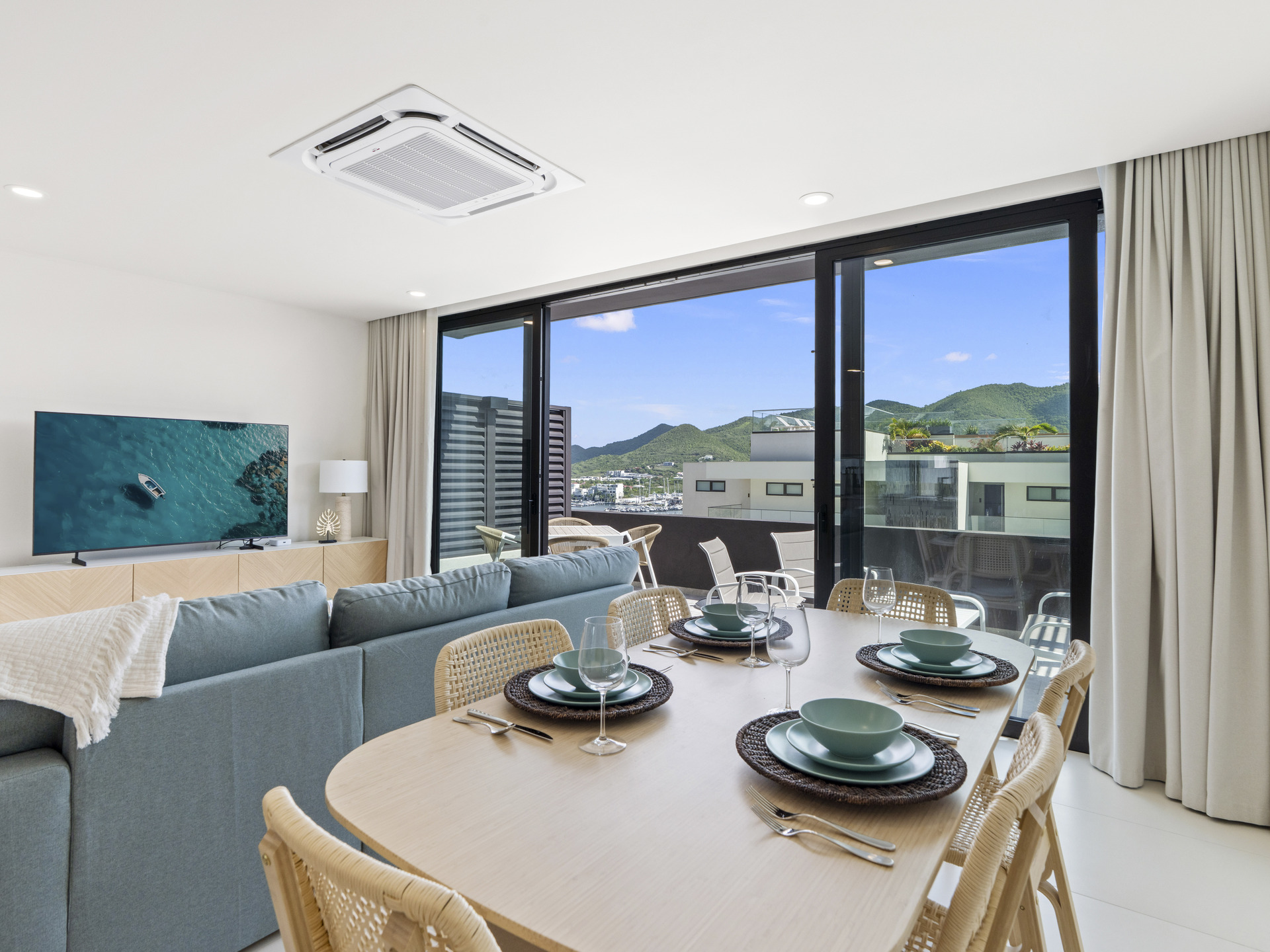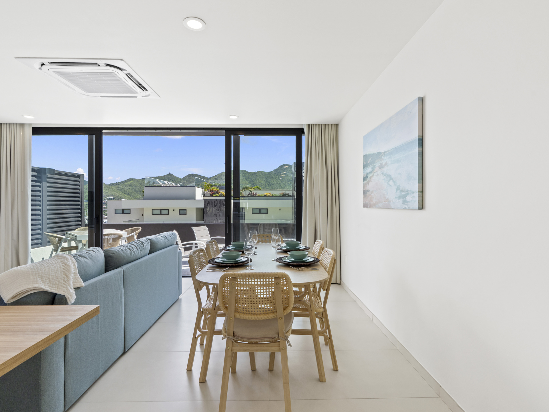 Découvrez cette superbe suite d’angle de deux chambres et deux salles de bain, parfaitement conçue pour allier confort moderne et élégance naturelle. Située au rez-de-chaussée du bâtiment 3, cette résidence offre un accès facile tout en offrant une vue panoramique imprenable sur l’océan, Anguilla, le lagon et les montagnes verdoyantes environnantes.