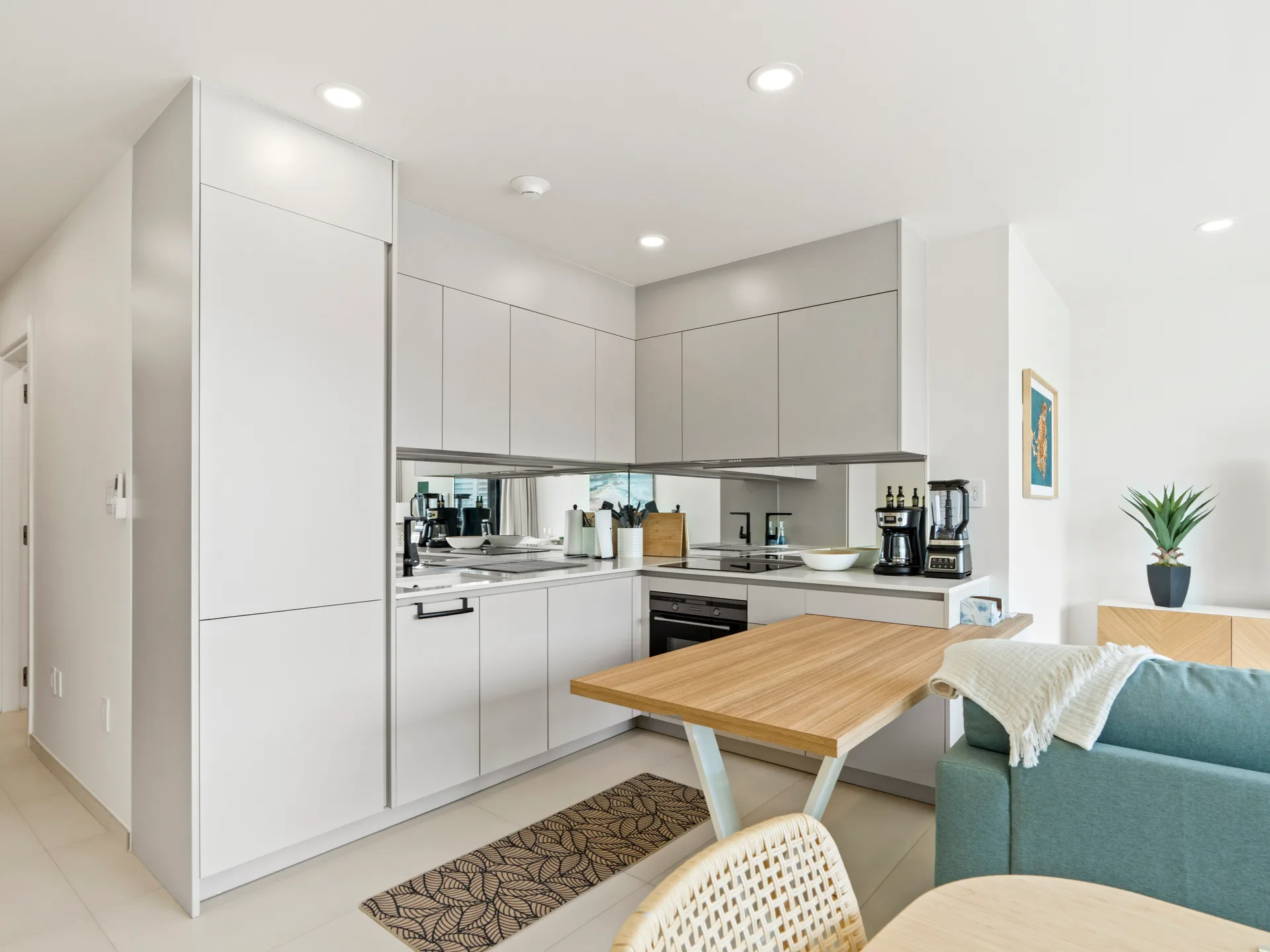 Cuisine moderne entièrement équipée d’électroménagers haut de gamme, d’armoires élégantes et d’un grand plan de travail — idéale aussi bien pour des repas décontractés que gastronomiques.