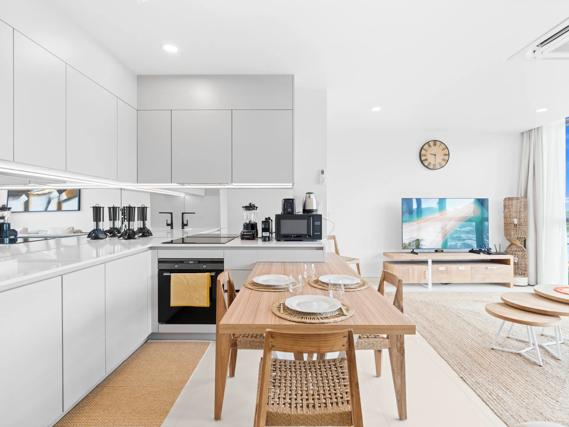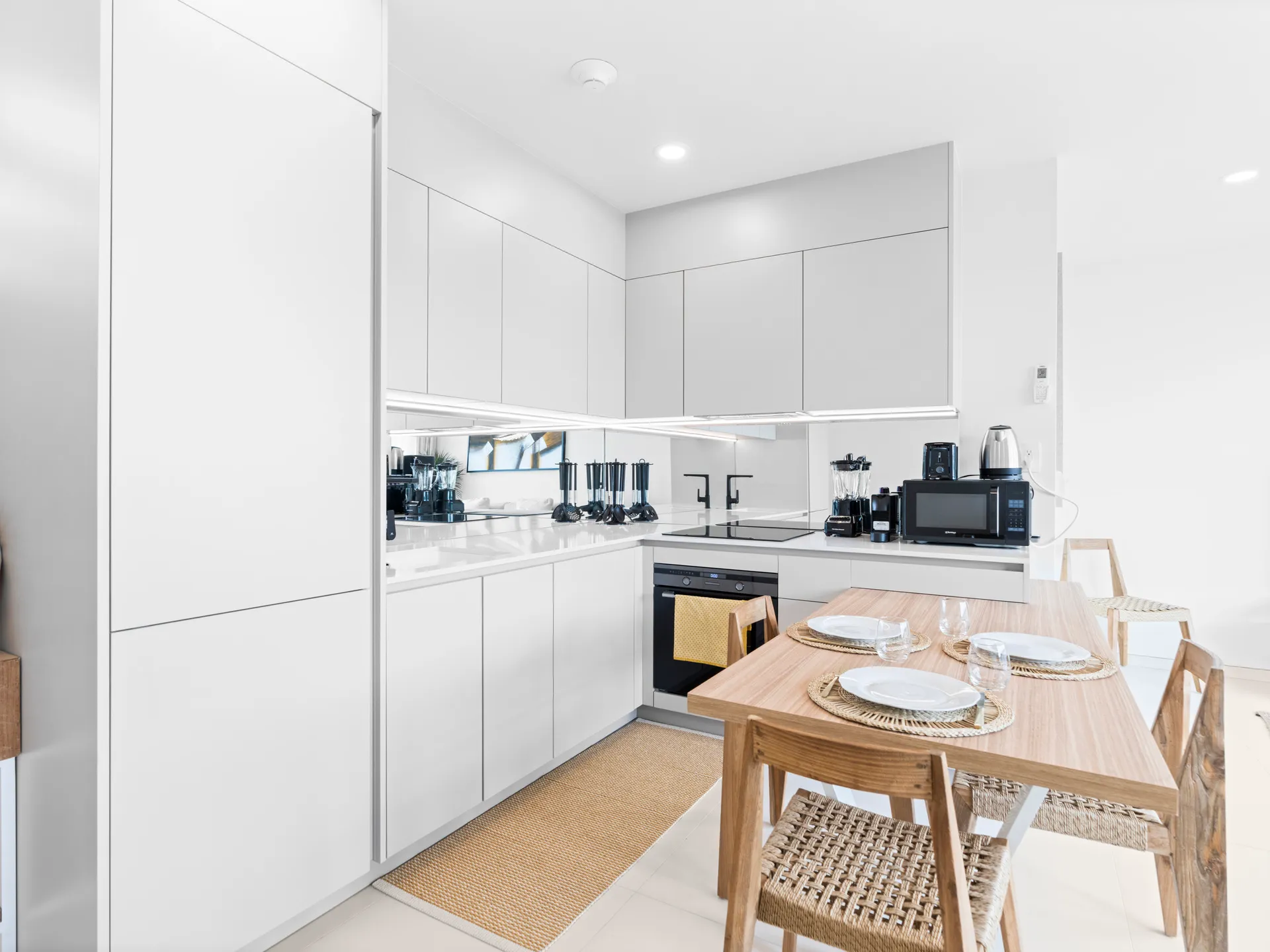 Cuisine moderne et entièrement équipée comprenant four, réfrigérateur, lave-vaisselle, machine Nespresso et tous les essentiels de cuisine.