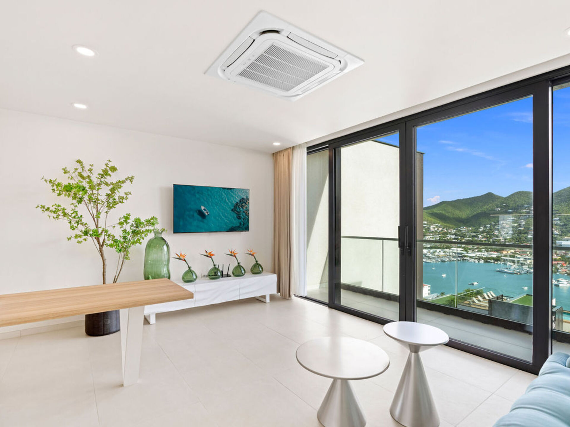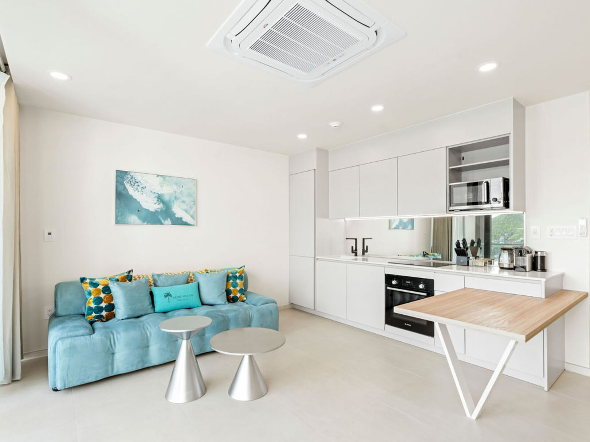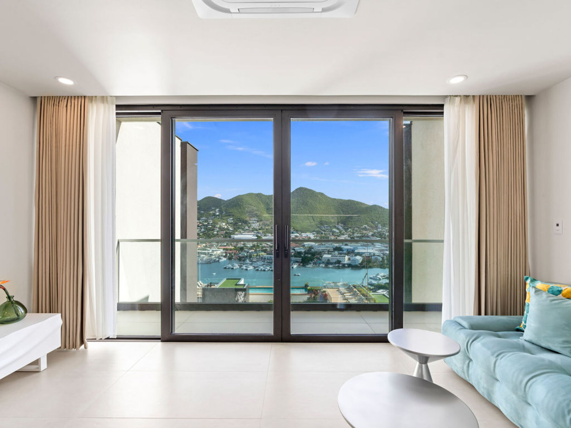 Salon lumineux donnant sur un balcon privé avec vue panoramique sur le lagon – idéal pour profiter de l’ambiance caribéenne.