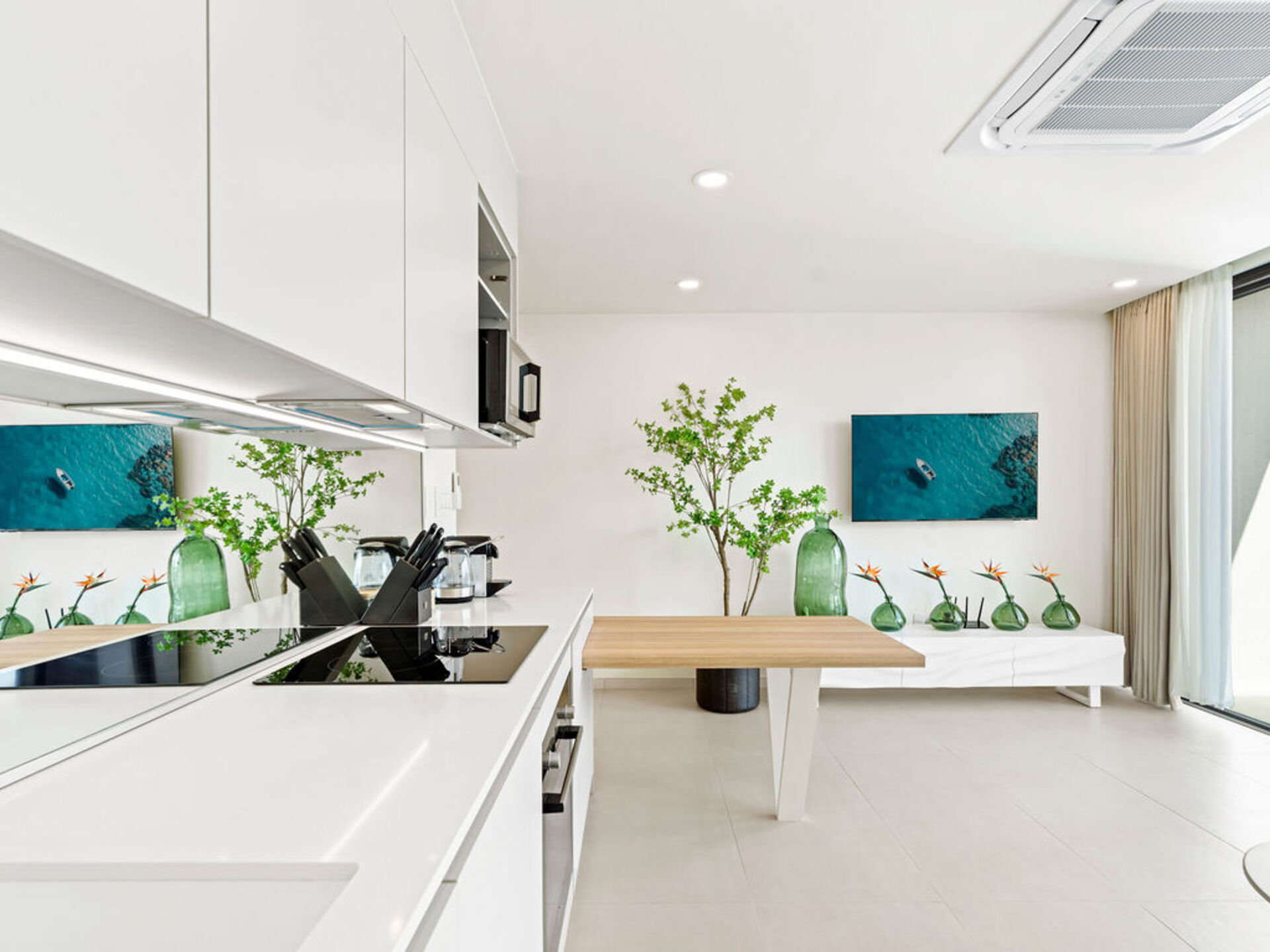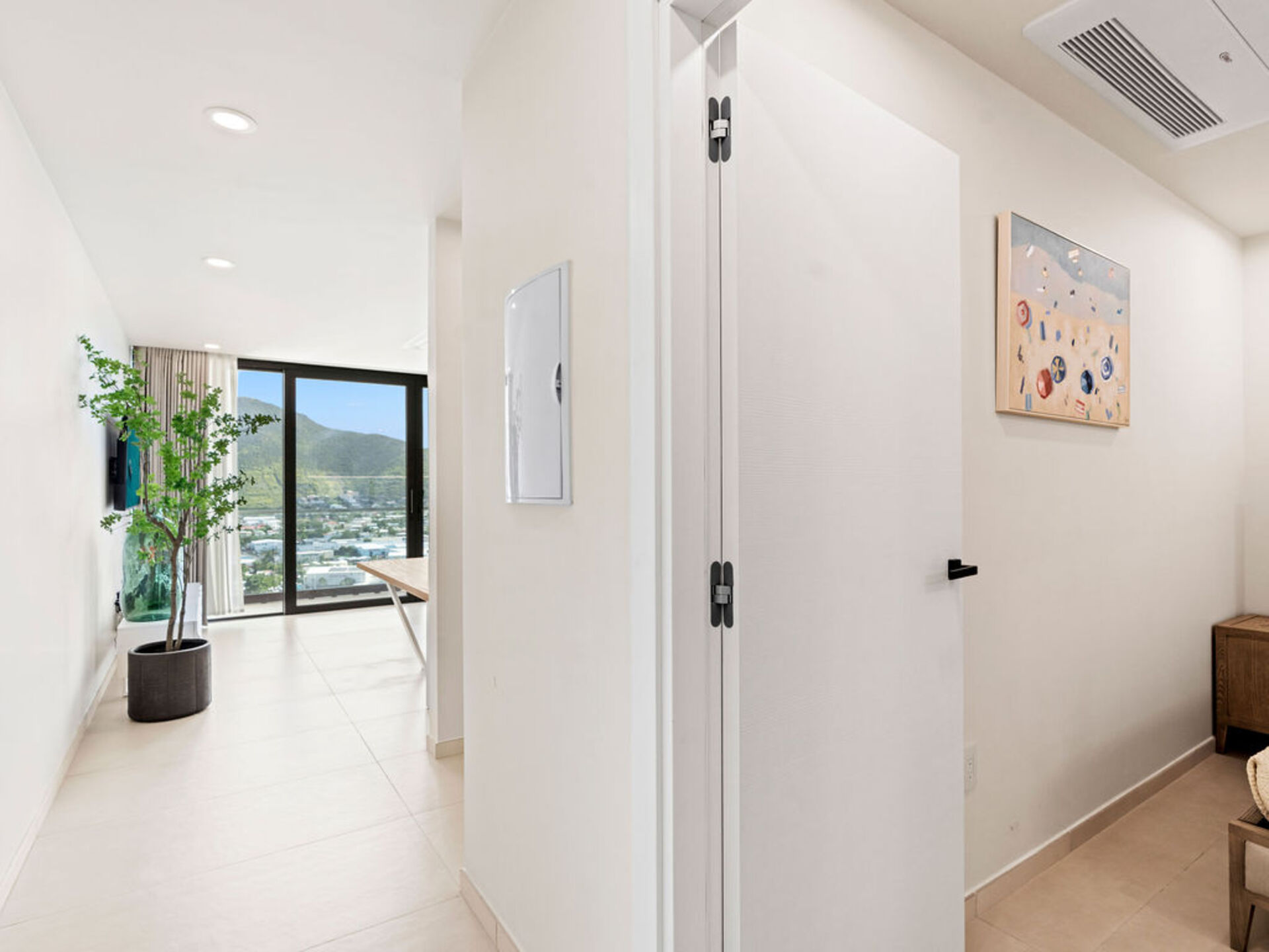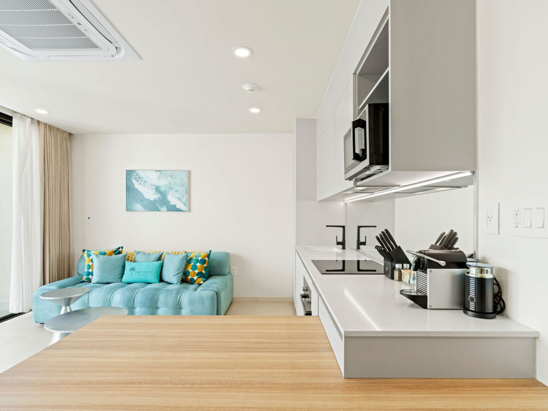 Salon lumineux donnant sur un balcon privé avec vue panoramique sur le lagon – idéal pour profiter de l’ambiance caribéenne.