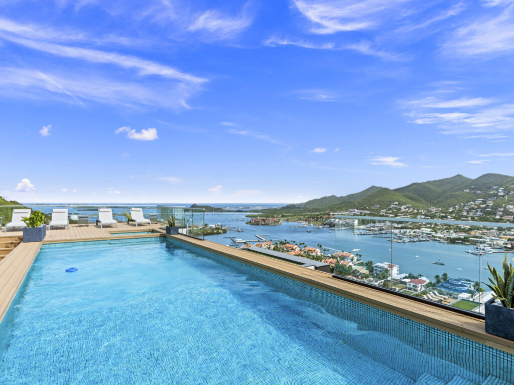 B242: Luxury apartment with lagoon view, balcony, rooftop pool, jacuzzi, in Simpson Bay for a relaxing getaway.