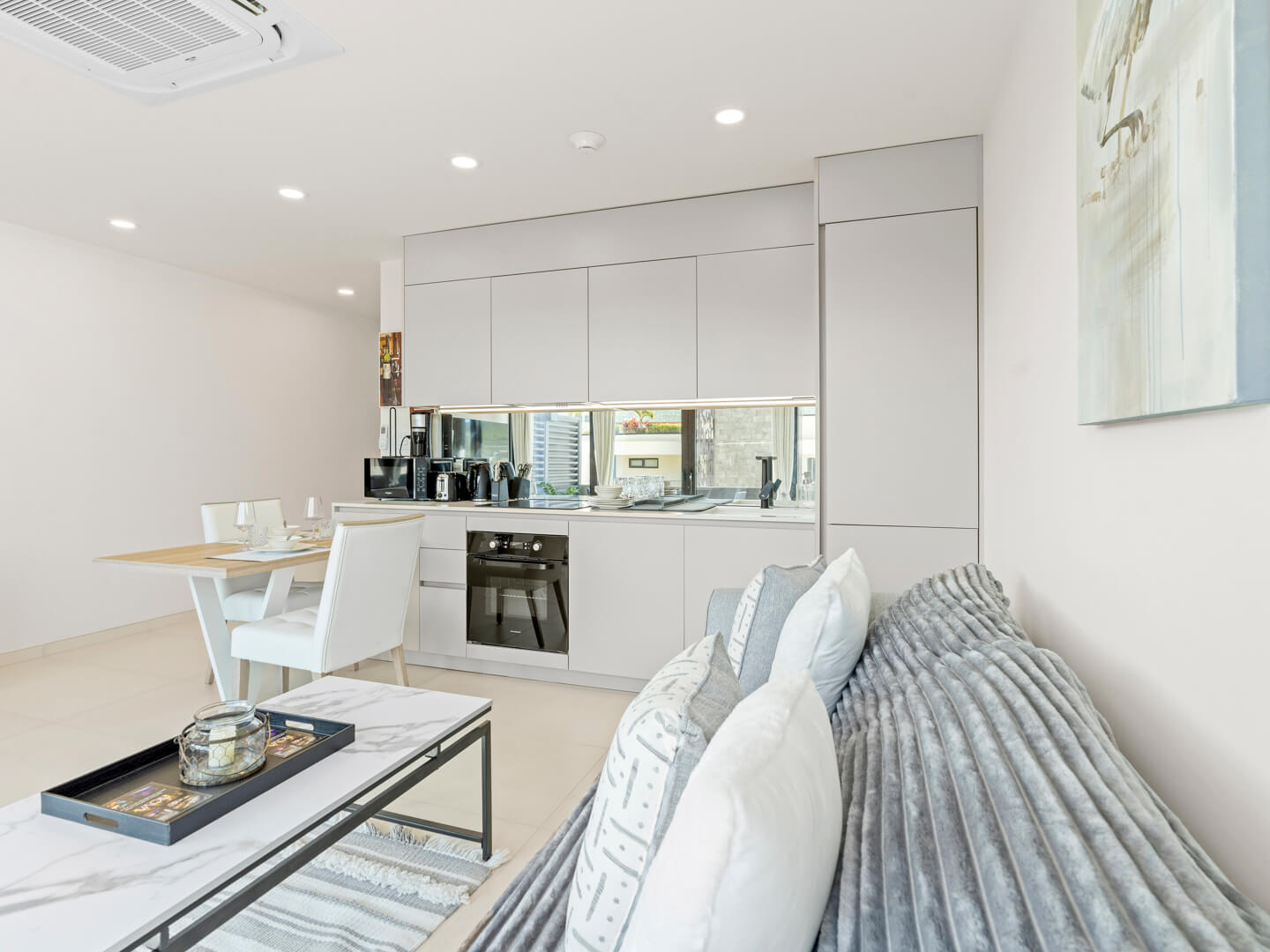 As you enter B205, you’re welcomed by a meticulously designed interior that blends modern aesthetics with a cozy appeal. The open-plan living area, furnished with chic pieces and flooded with natural light, creates a warm atmosphere ideal for unwinding after a day of exploring the island.