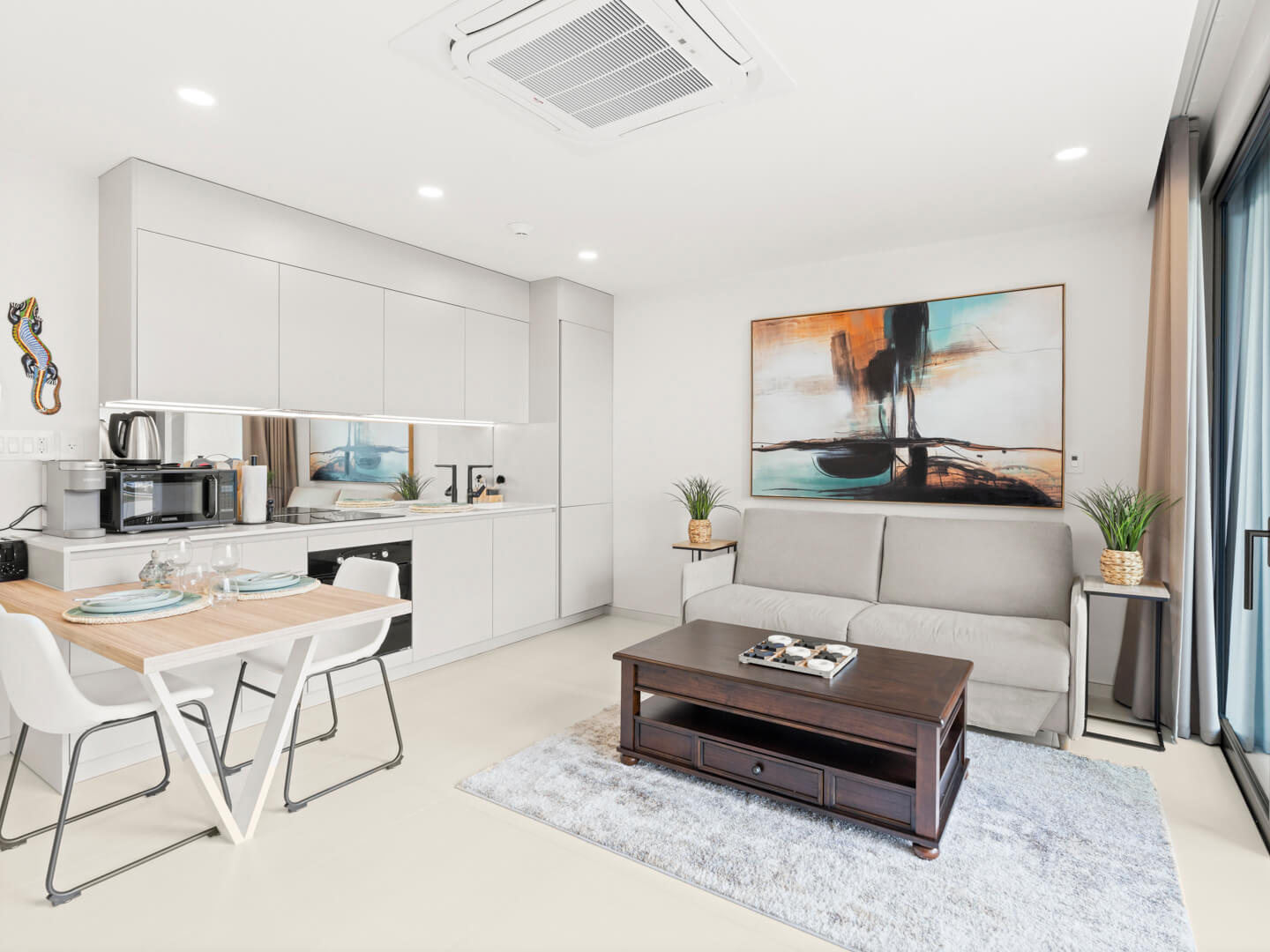 The heart of Apartment B-214 is its well-equipped kitchen, designed to cater to all your culinary needs. It boasts state-of-the-art appliances, including a sleek espresso machine for your morning brew, a dishwasher to ease the cleanup process, and a washing machine to keep your clothes fresh throughout your stay. Cooking enthusiasts will appreciate the thoughtful layout and ample counter space that make preparing meals a pleasure.
