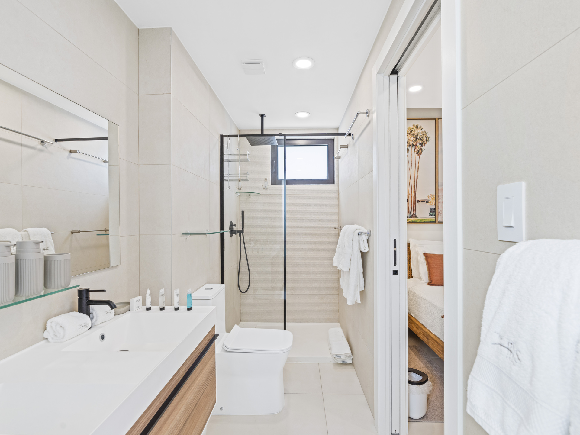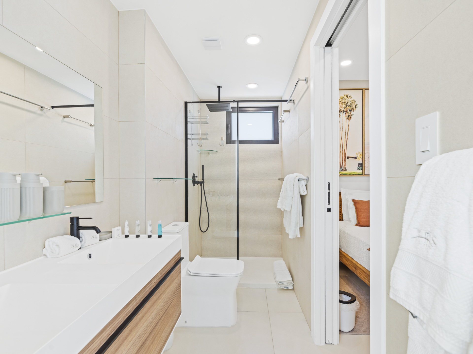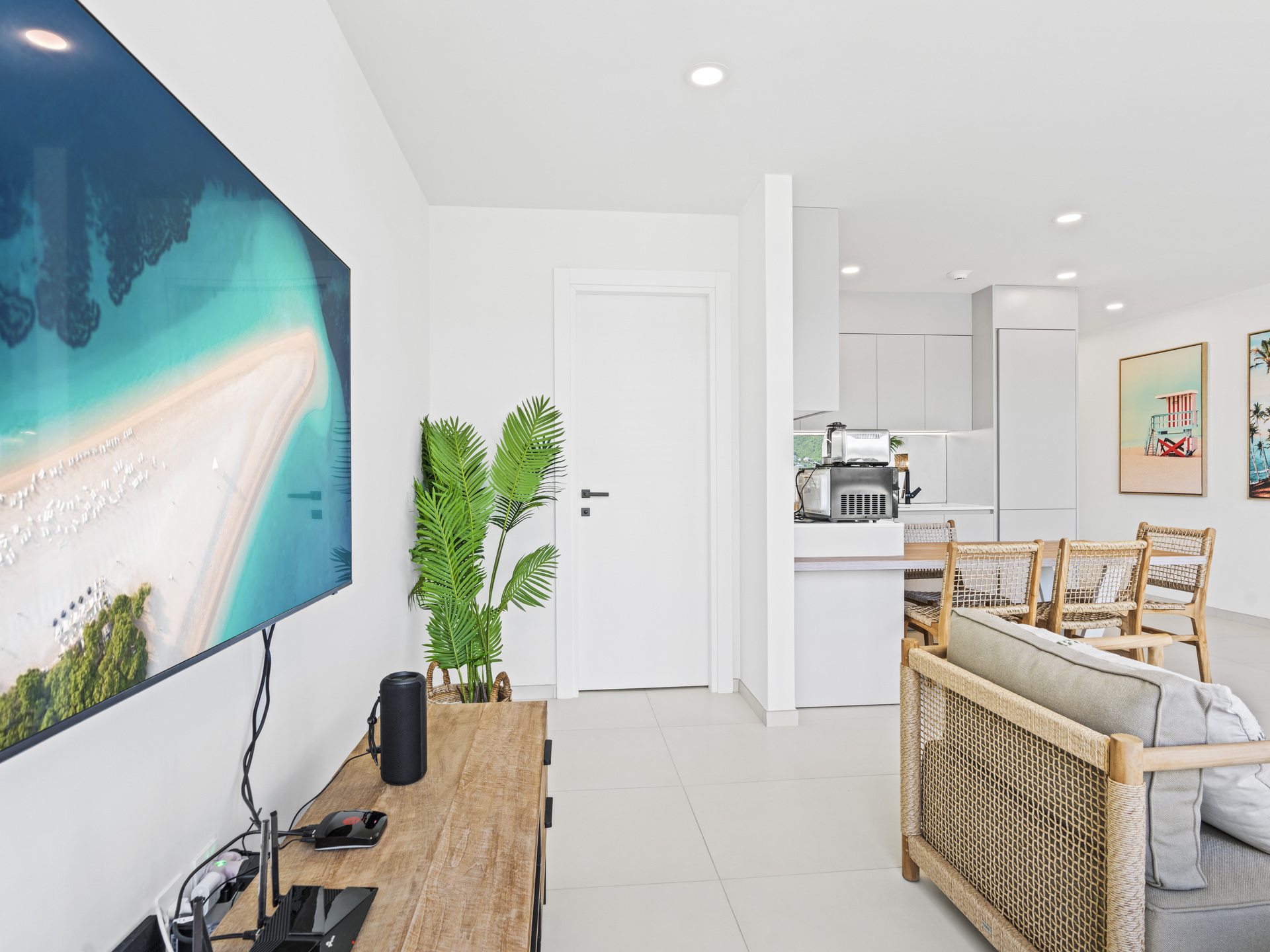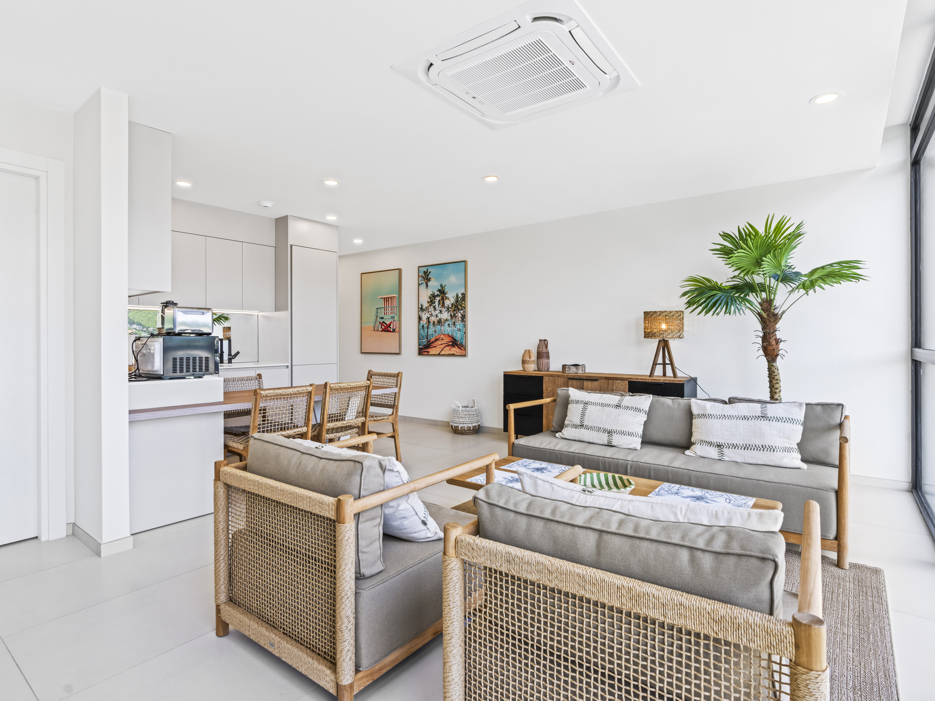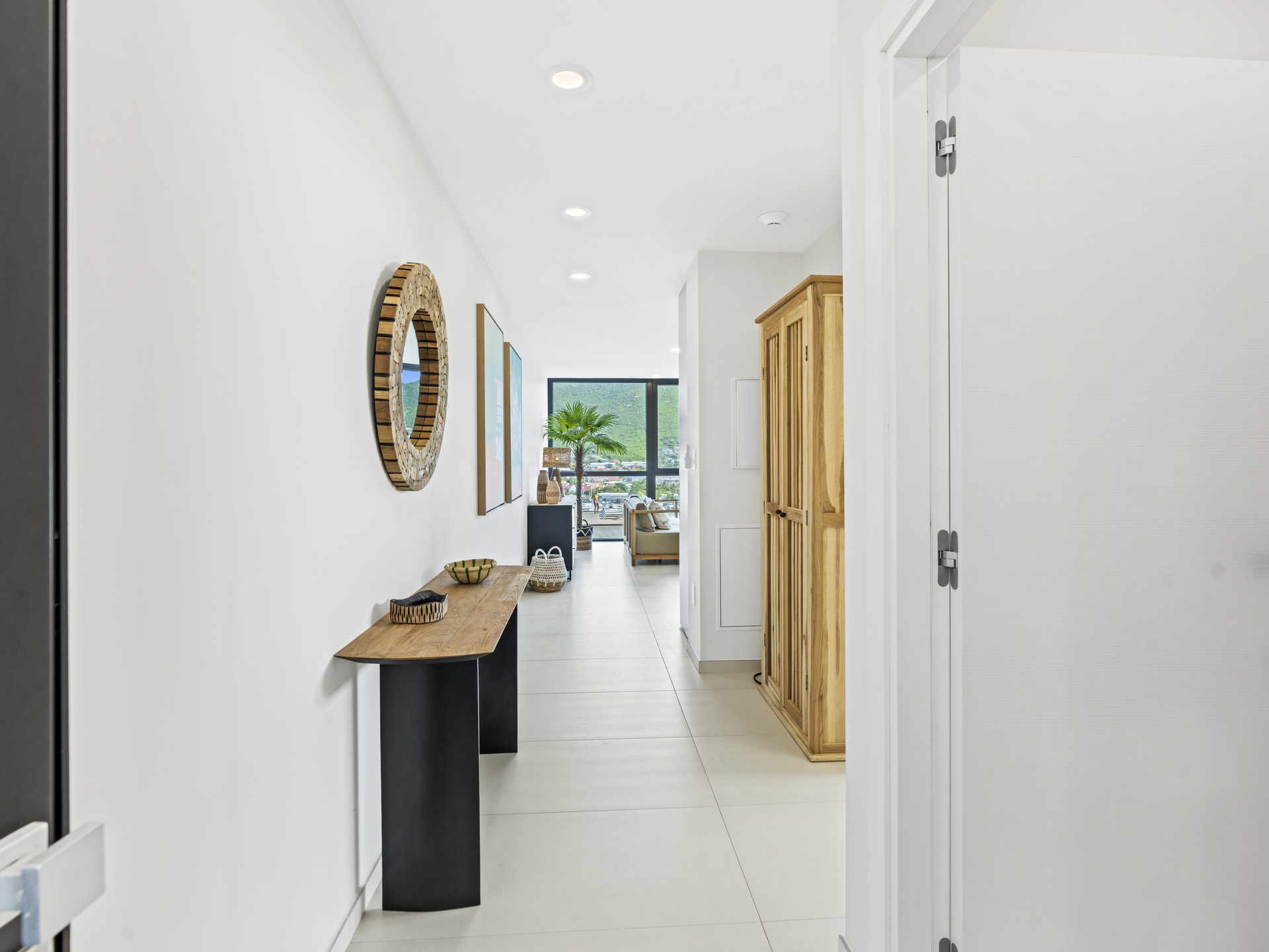 We are delighted to present our stunning two-bedroom apartment, located on the second floor of The Hills residence. With its 75m² of elegant space and its glass wall offering a breathtaking view of the lagoon, this apartment is a real gem.