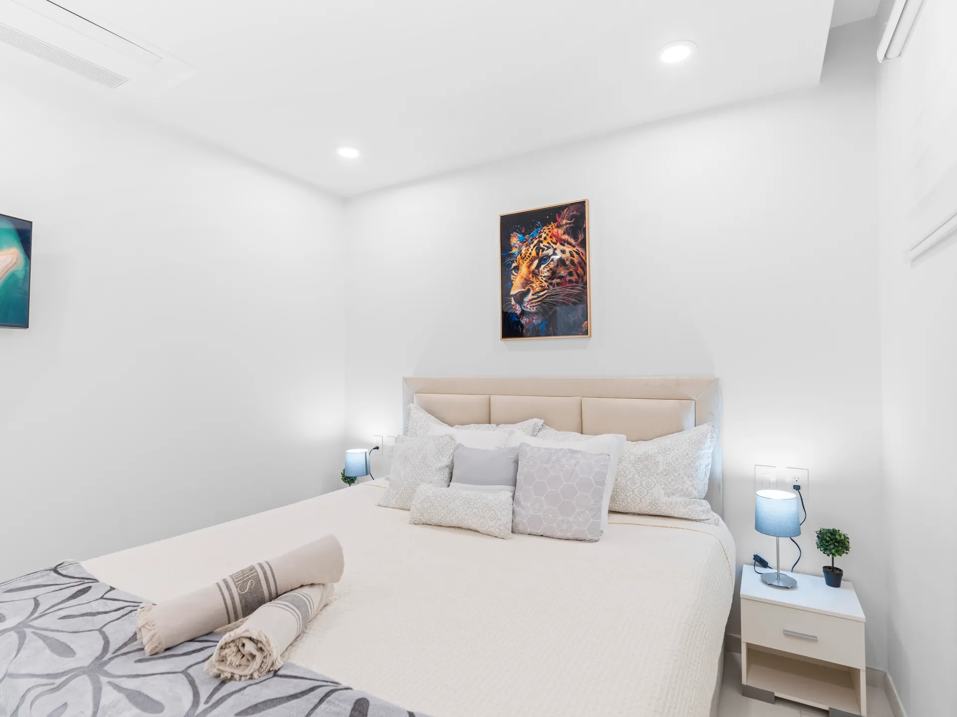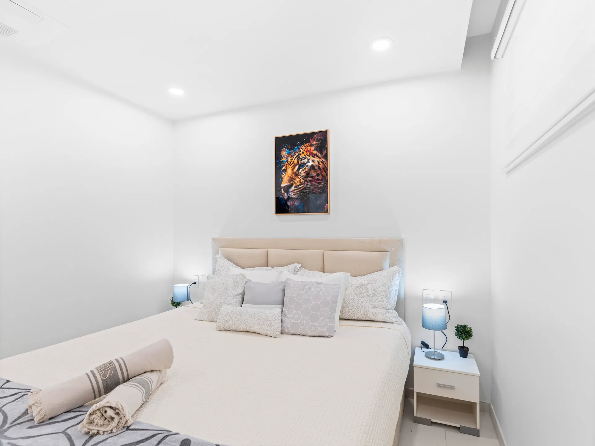 Comfortable and well-appointed bedroom with ample storage, providing an inviting space to relax and unwind after a day of exploring the island.