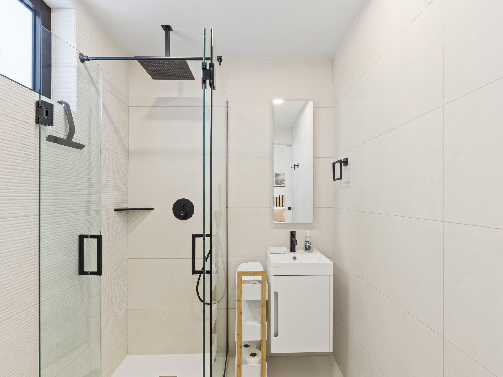 Both bedrooms are thoughtfully designed to offer maximum comfort and privacy. The primary bedroom features large windows that fill the space with natural light and an en-suite bathroom with a single vanity and luxurious rain shower, creating a spa-like retreat. The second bedroom is equally inviting—ideal for family, friends, or guests—and is conveniently located near the second full bathroom, which is elegantly appointed with modern fixtures.