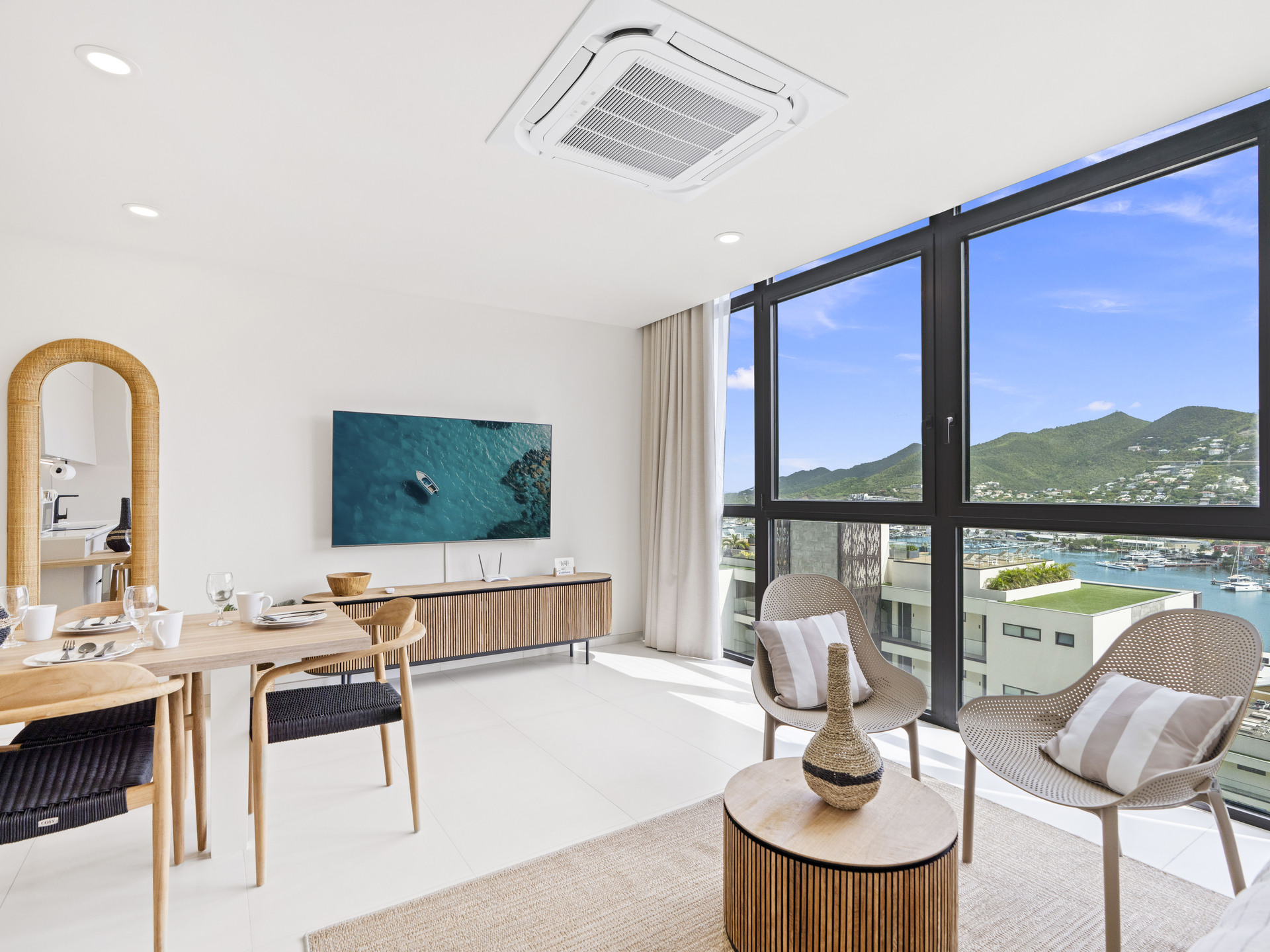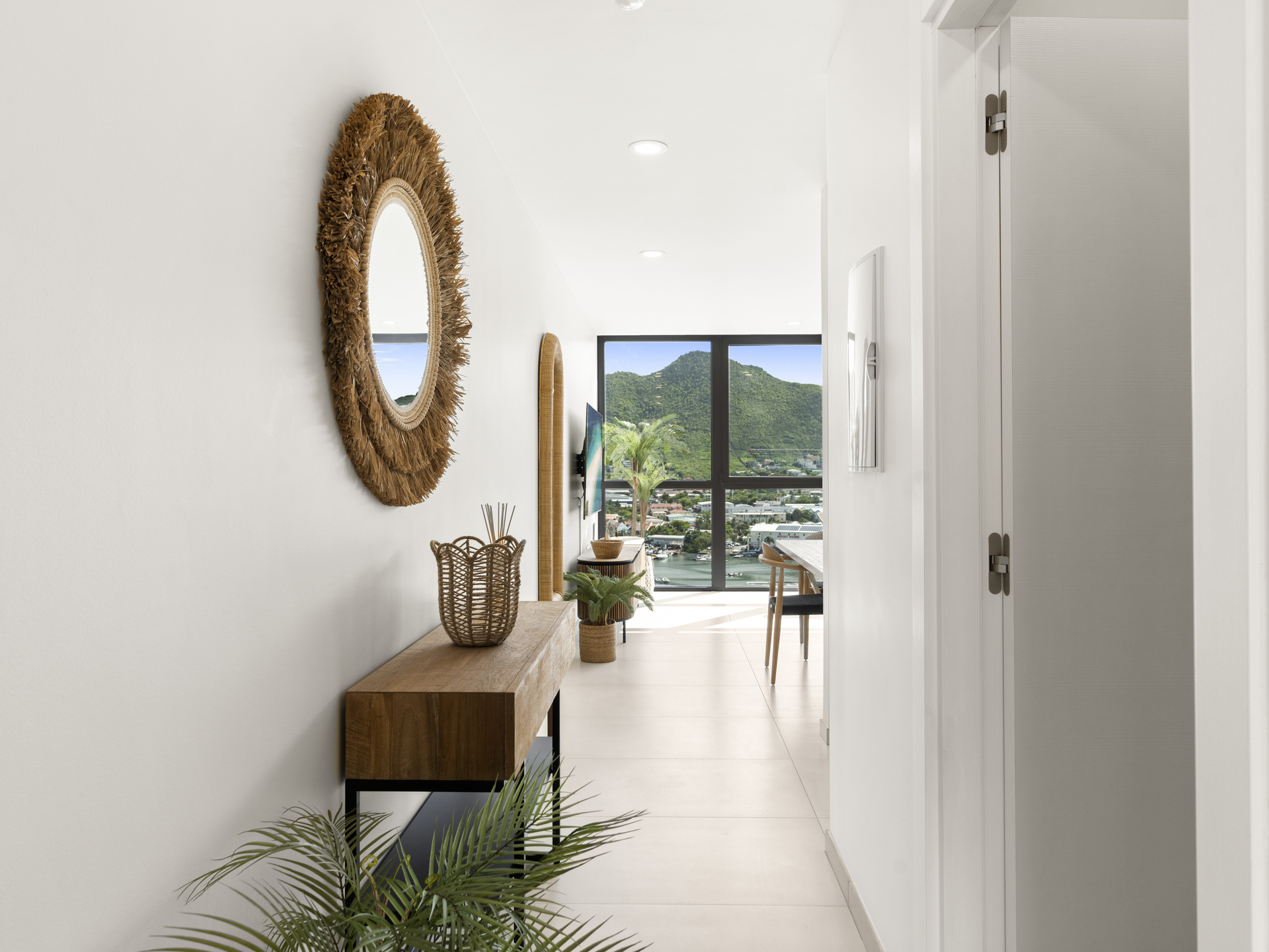 Experience the perfect blend of comfort, style, and stunning scenery in this modern 1-bedroom, 1-bathroom apartment, located on the second floor of Building C. Ideal for couples or solo travelers, this bright and airy space offers breathtaking views of the Simpson Bay Lagoon through large windows that flood the apartment with natural light.