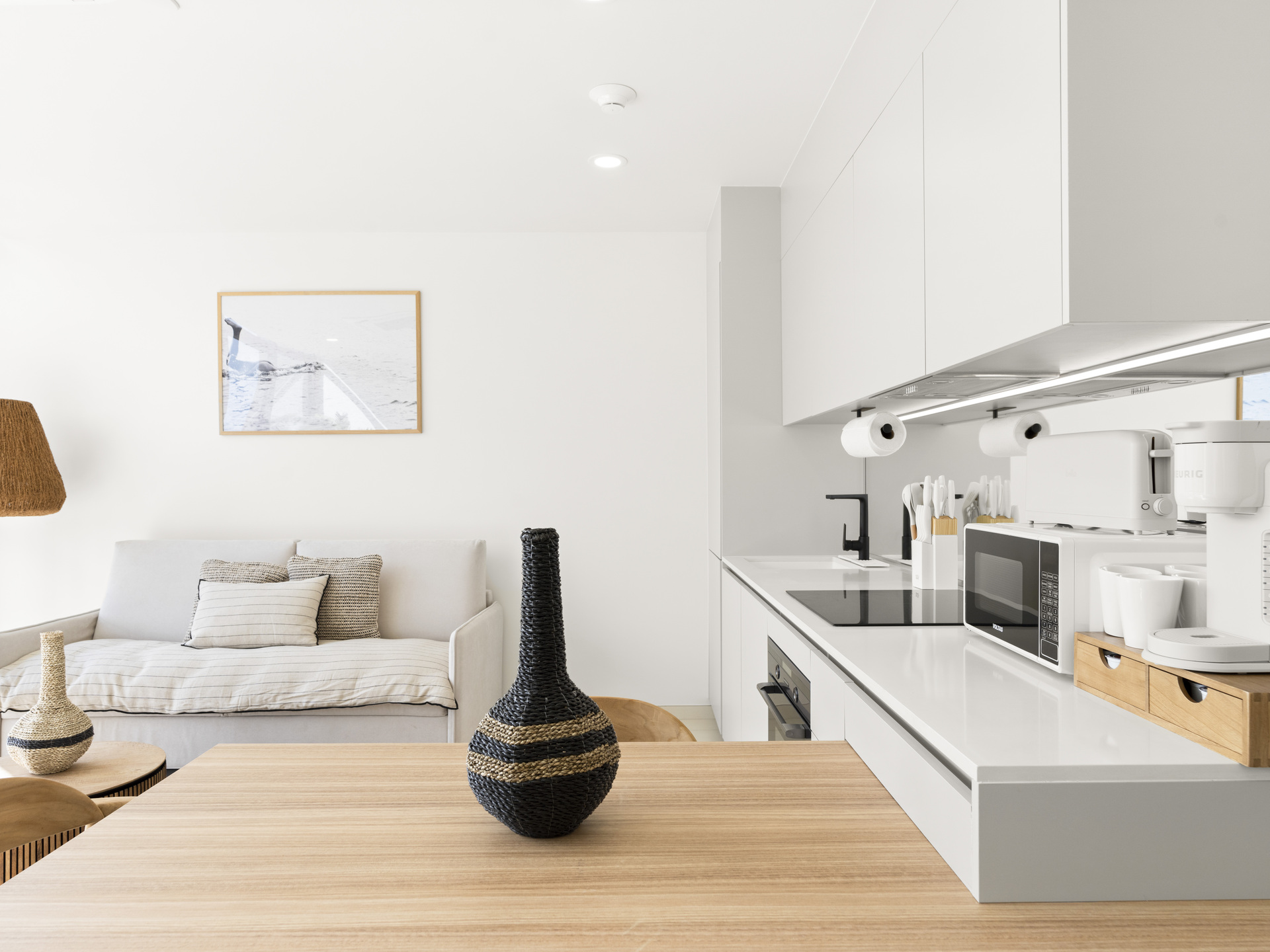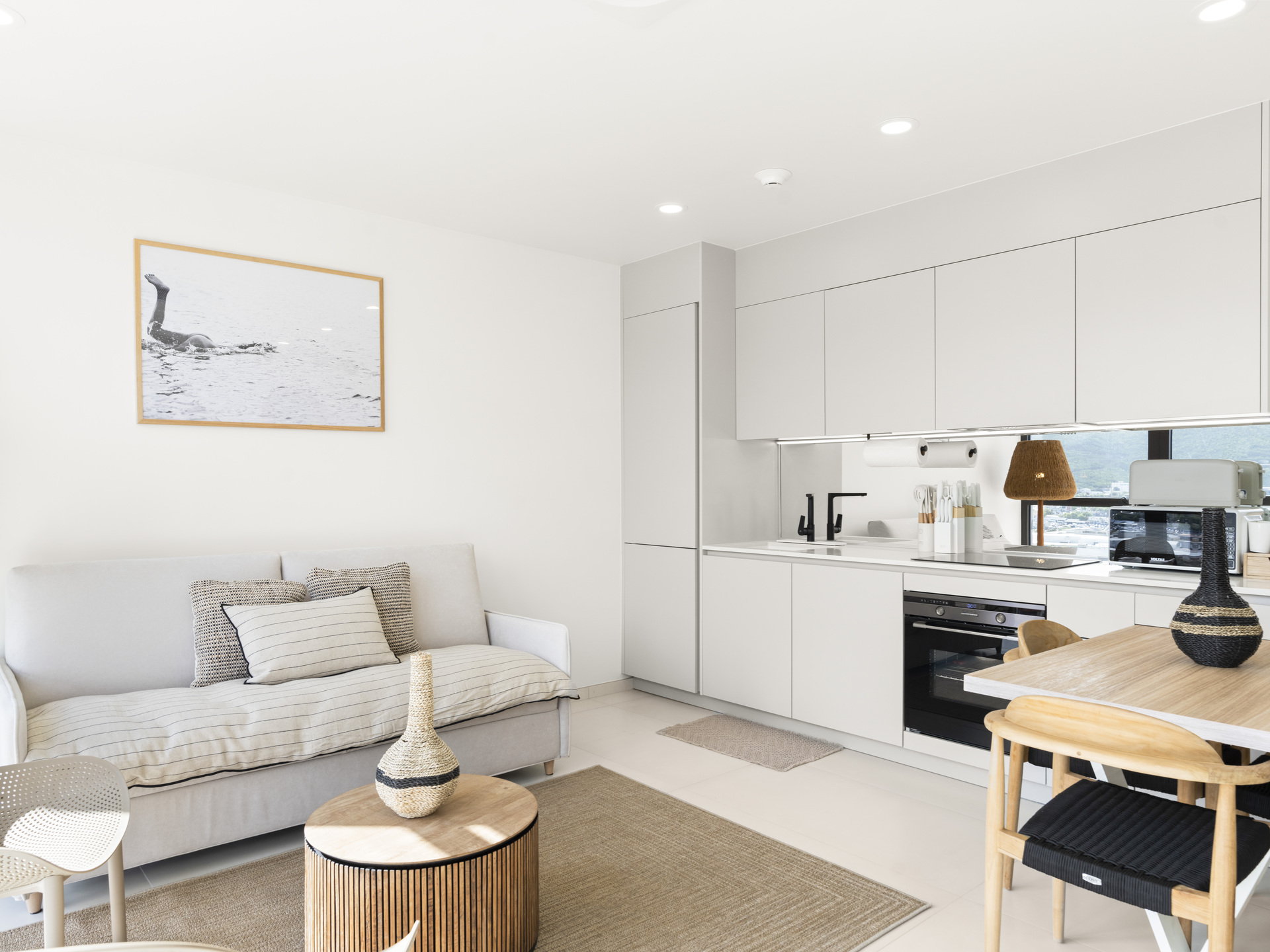 Inside, you’ll find a cozy bedroom, a sleek bathroom, and an open-concept living area that flows into a fully equipped kitchen—perfect for everything from morning coffee to romantic dinners with a view.