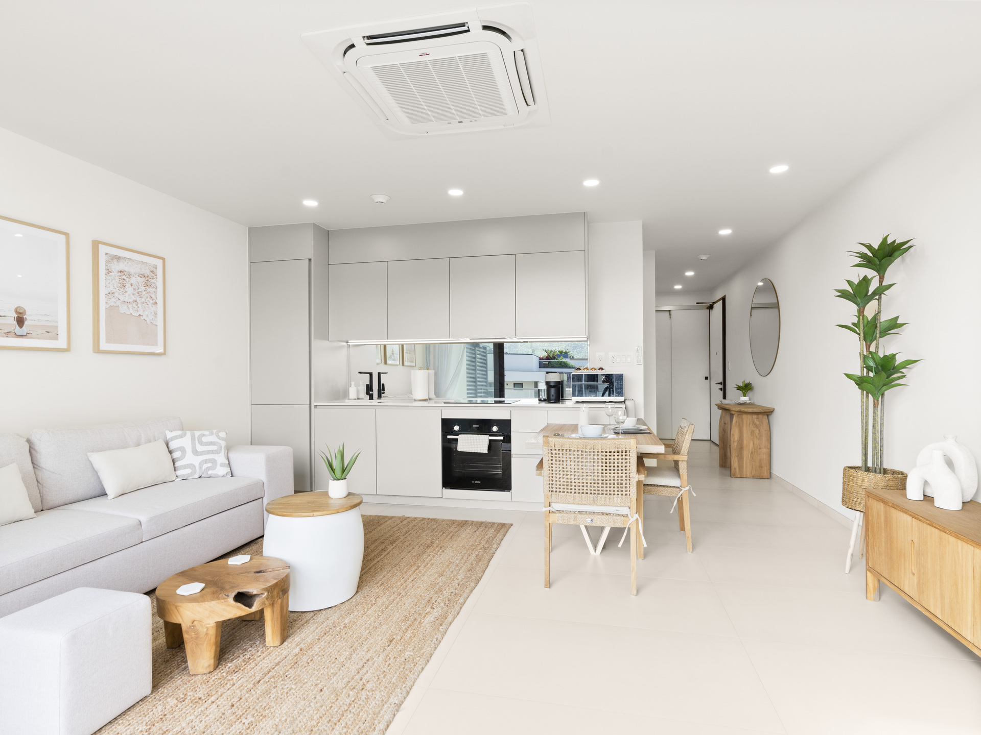 The heart of the apartment is a practical open-concept living area that flows seamlessly into a functional kitchen, giving you everything you need for a comfortable stay. After a day of adventure, unwind in your private bedroom, a quiet sanctuary designed for a restful night’s sleep.