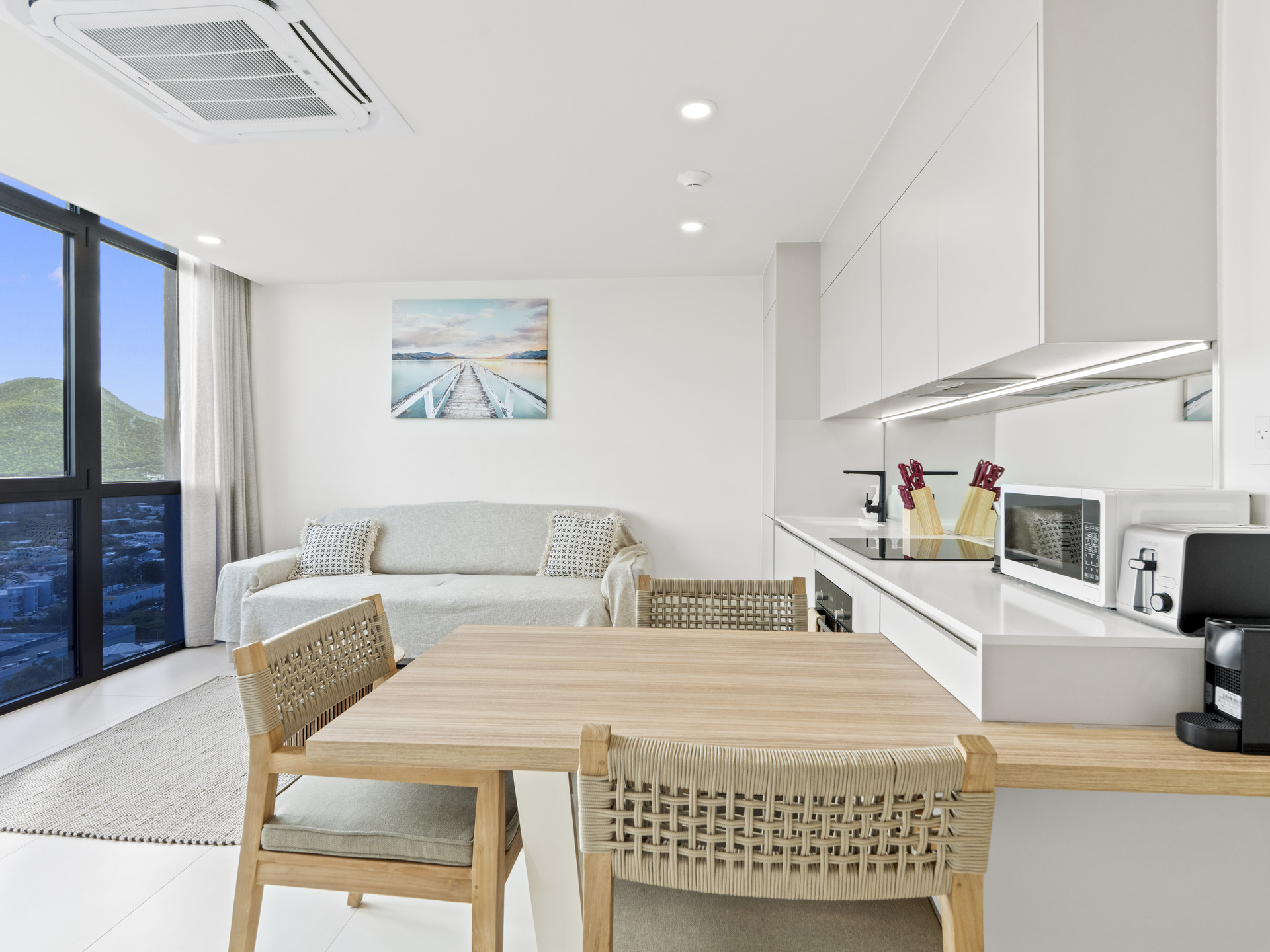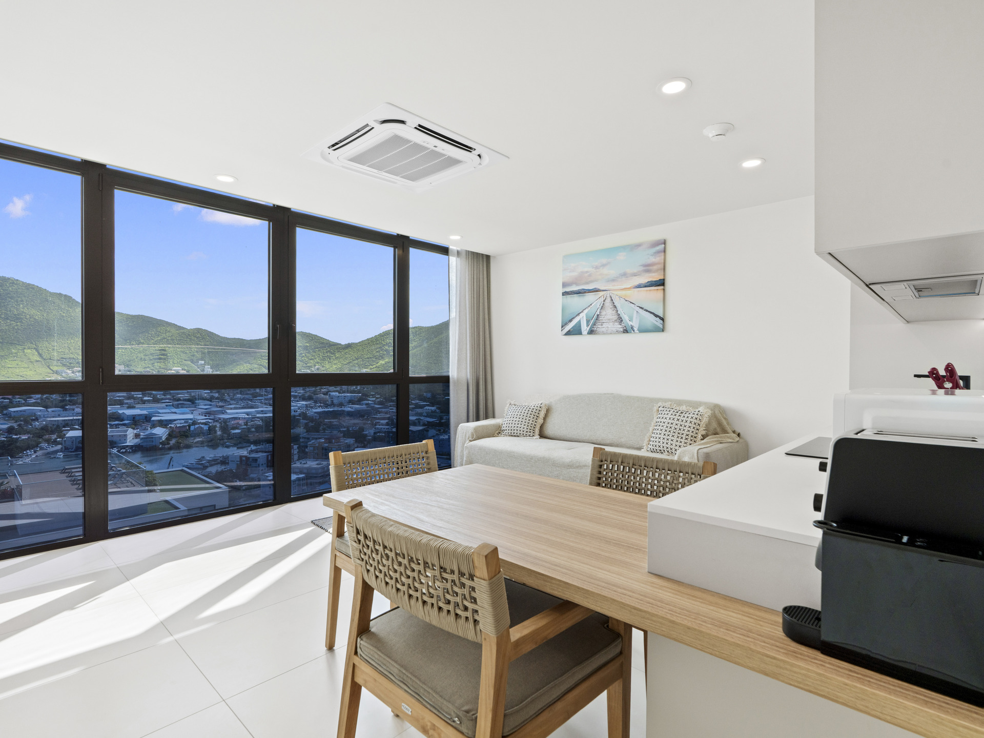 The showstopping feature of this residence is the floor-to-ceiling wall of glass, which floods the interior with natural light and provides uninterrupted panoramic views, bringing the beauty of the outdoors right into your living space. The open-concept living and dining area is thoughtfully designed with contemporary furnishings and a warm, inviting ambiance — ideal for both relaxing and entertaining.