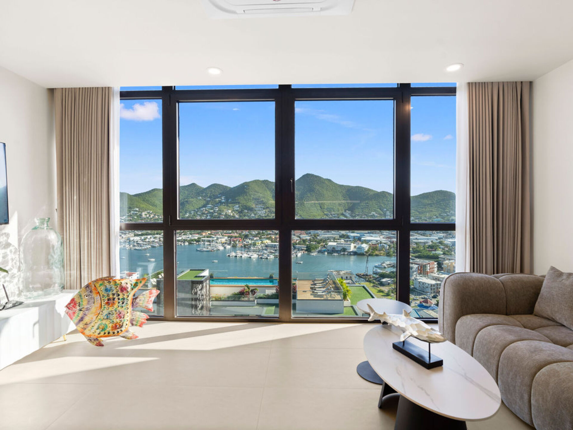 Bright living room with panoramic lagoon views – ideal for enjoying the Caribbean atmosphere.