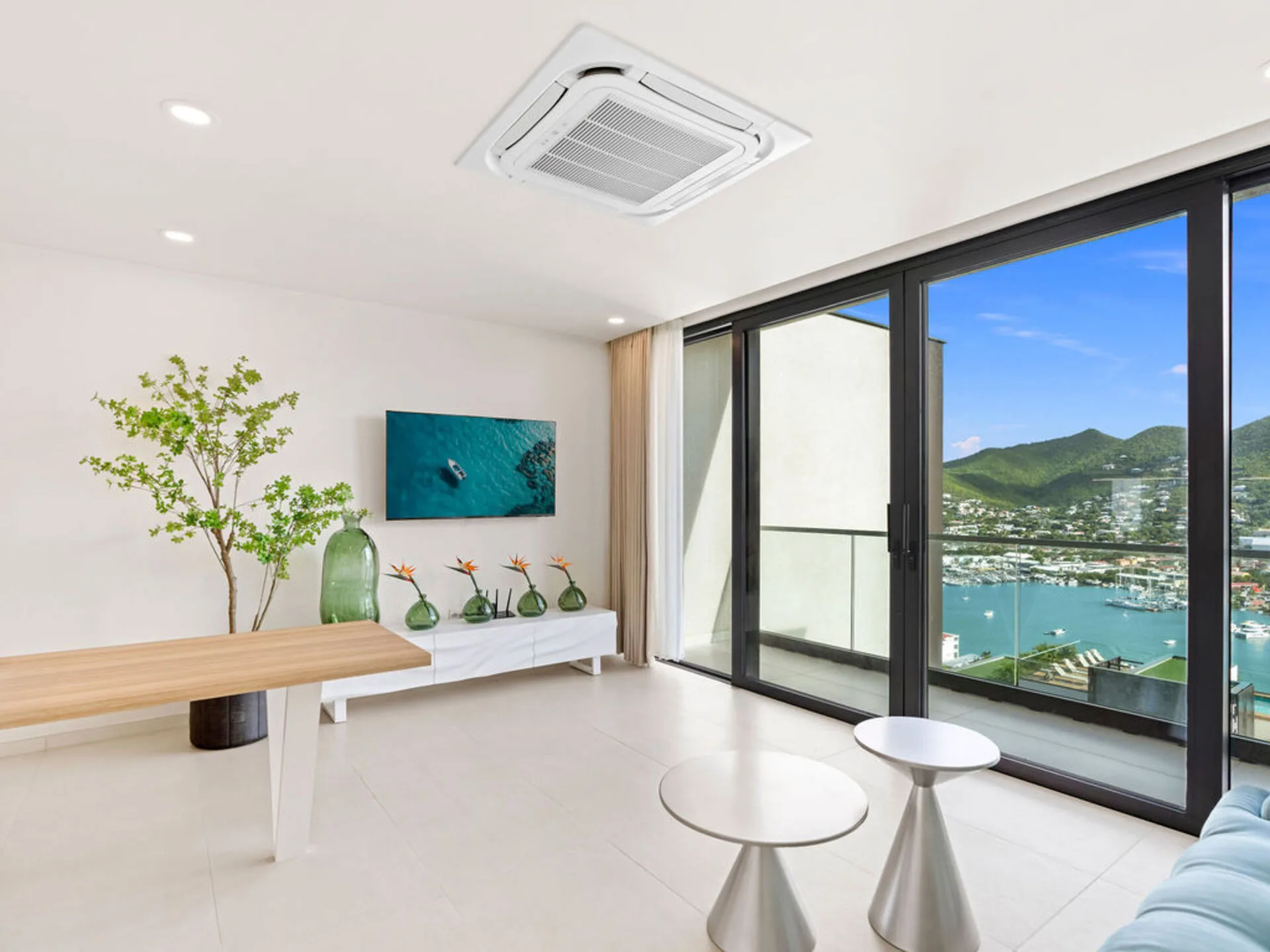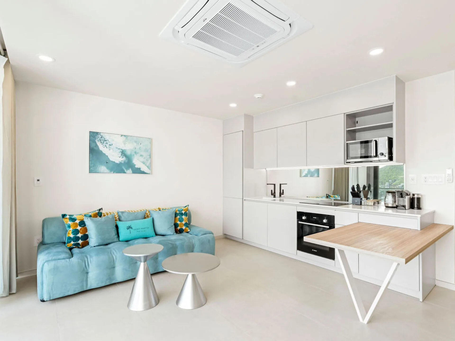 Bright living room opening onto a private balcony with panoramic views of the lagoon – ideal for enjoying the Caribbean ambiance.