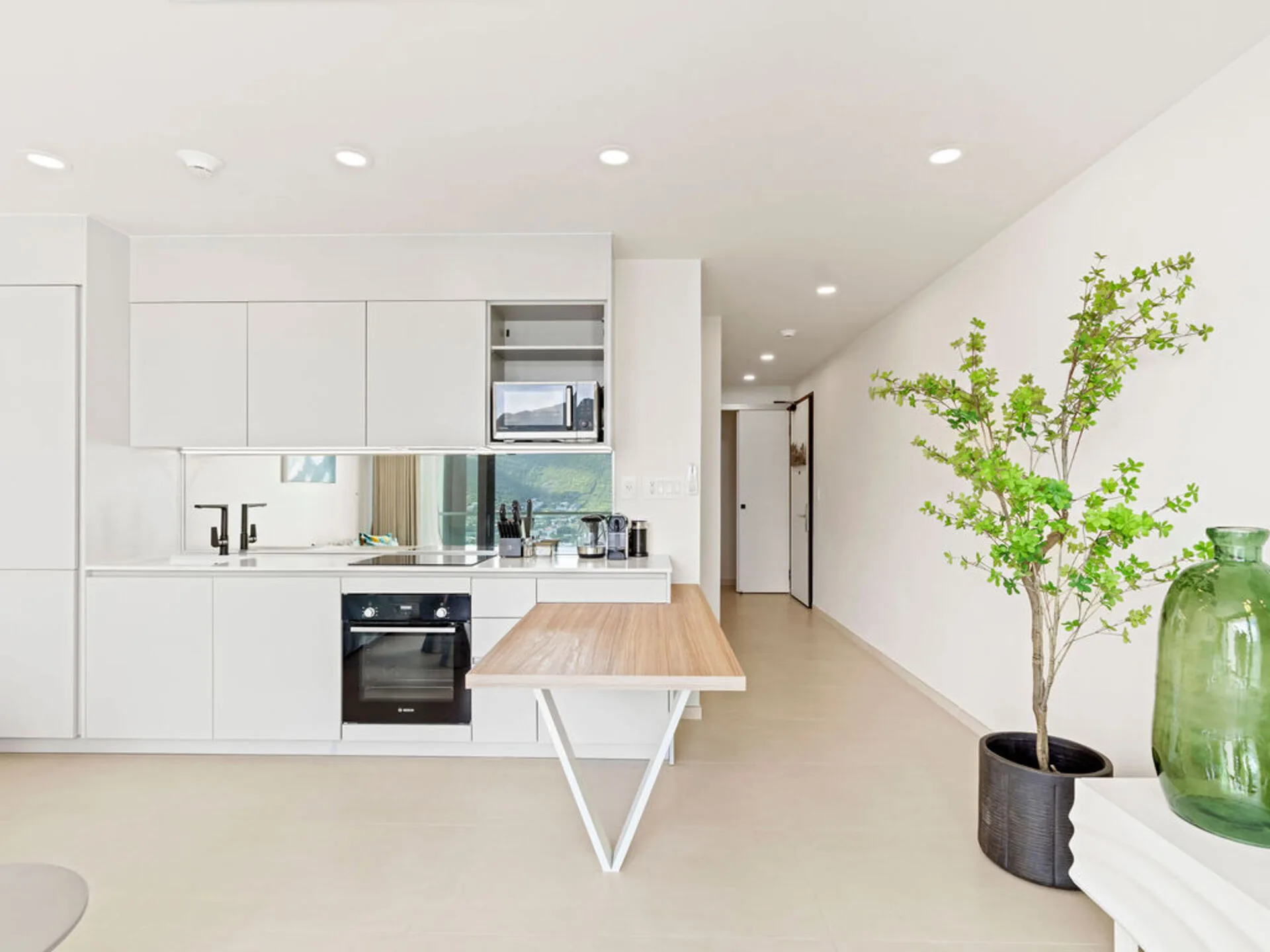 Fully equipped kitchen including refrigerator, oven, stovetop, microwave, and essential utensils – perfect for preparing meals with ease.