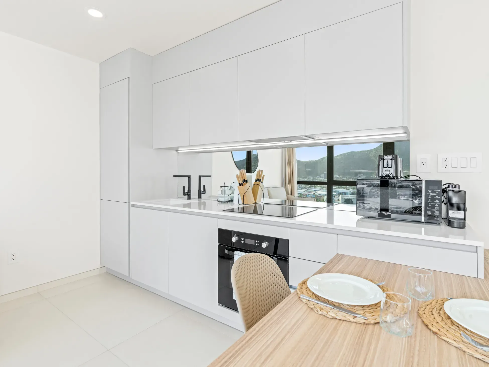 Fully equipped kitchen with dishwasher, refrigerator, oven, stovetop, and Nespresso machine for your morning coffee.