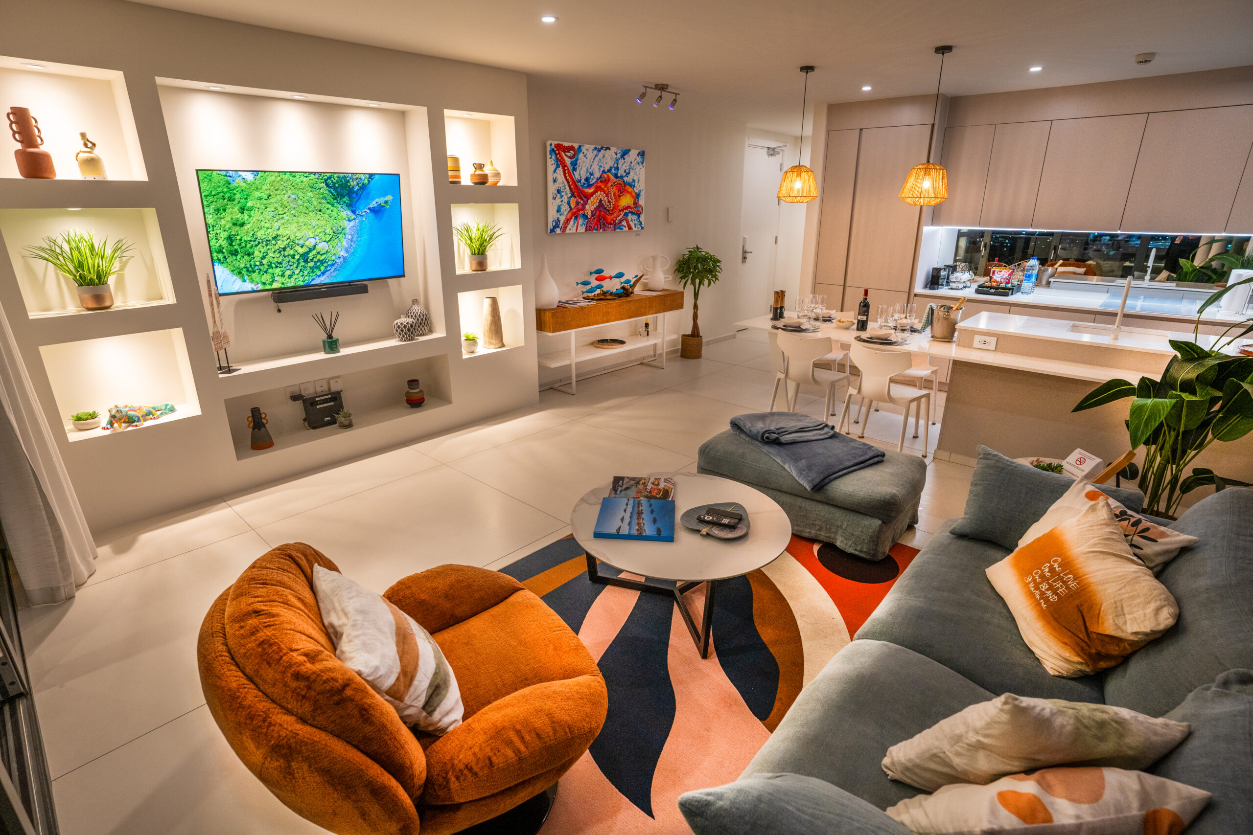 The living-dining area is designed for relaxation and entertainment. Highlights include: